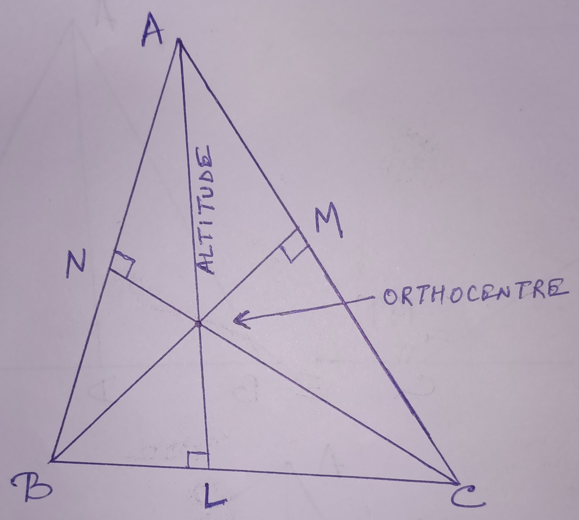 An altitude of a triangle is considered via drawing perpendicular from any vertex of the triangle to the opposite side. It is considered that, any triangle should have three altitudes. In the figure, AL, BM, and CN are the altitudes of said ∆ ABC.
