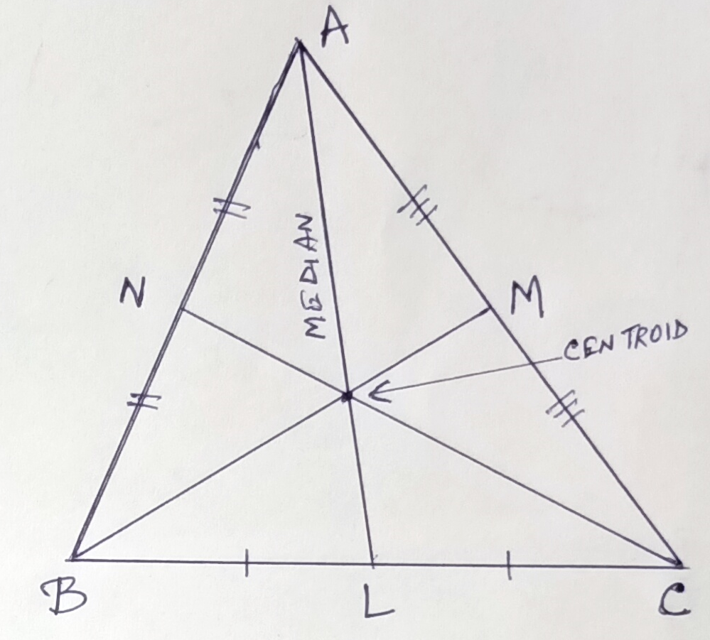 The line segment which is joining a vertex of a triangle to the midpoint of the opposite side is to be considered or called a median of the triangle. A triangle is considered to have three medians. In the figure, it has been seen that L, M, and N are the mid-points of the sides BC, CA, and AB respectively of the said triangle. So, AL, BM, and CN are considered as the medians of ∆ ABC.
