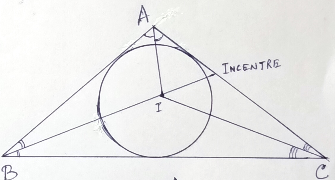 The circle that lies inside a triangle and touches its three sides then will be called or considered as the incircle. The centre of the incircle is called or to be considered as the incentre. The incentre is the point at which the three (internal) bisectors of the angles of the triangle is observed to meet each other. In the figure, we can observe that AI, BI, and CI bisect ∠A, ∠B, and ∠C respectively and meet at point I, which is to be considered incentre.