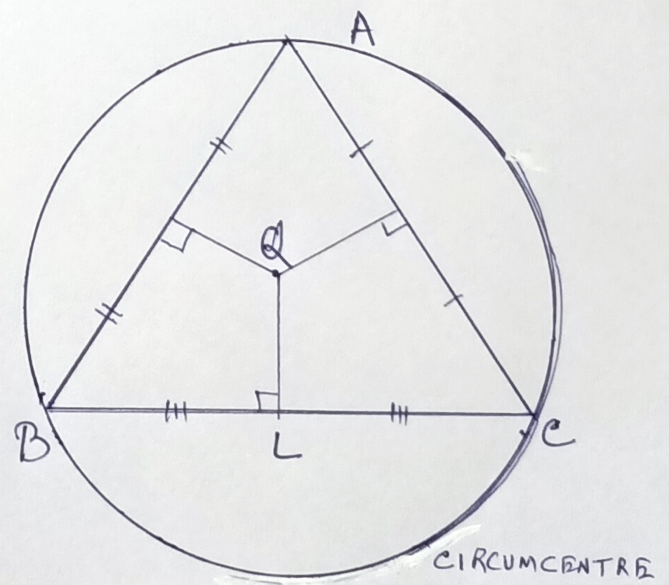 The circumcircle of a triangle is the circle which passes through its three vertices as we can observe from the given picture. Its centre is called the circumcentre, the point at which the perpendicular bisectors of the sides of the triangle when meets each other then this point is to be considered as circumcentre.