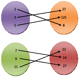 The set of all the first elements (or components) of the ordered pairs of a relation is considered to be the domain of the relation. The set of all the second elements (or components) of the ordered pairs of a relation is to be considered the range of the relation. In the preceding two examples the domains are {2, 3, 5} and {7, 9, 11}, while the ranges are {8, 27, 125} and {14, 22, 27} respectively. Notice that in the first case, domain = set A and range = set B, but in the second case, domain ≠ set A and range ≠ set B. In fact, domain ⊂ set A and range ⊂ set B.