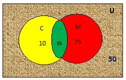 Example.- A) Out of 50 students in a class someone like either Chocolate or Cake or both, 25 like Chocolate while 15 like both. Draw a Venn diagram and find the number of students who like 1) Cake, 2) Only Cake and 3) Only Chocolate.