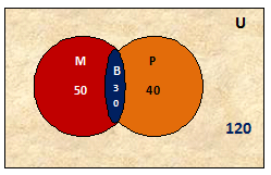As per the given condition, n(M) = 80, n(P) = 70, n(M U P) = 120