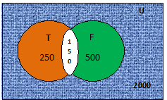 As per the given condition, n(T) = 250, n(F) = 500, n(T ∩ F) = 150